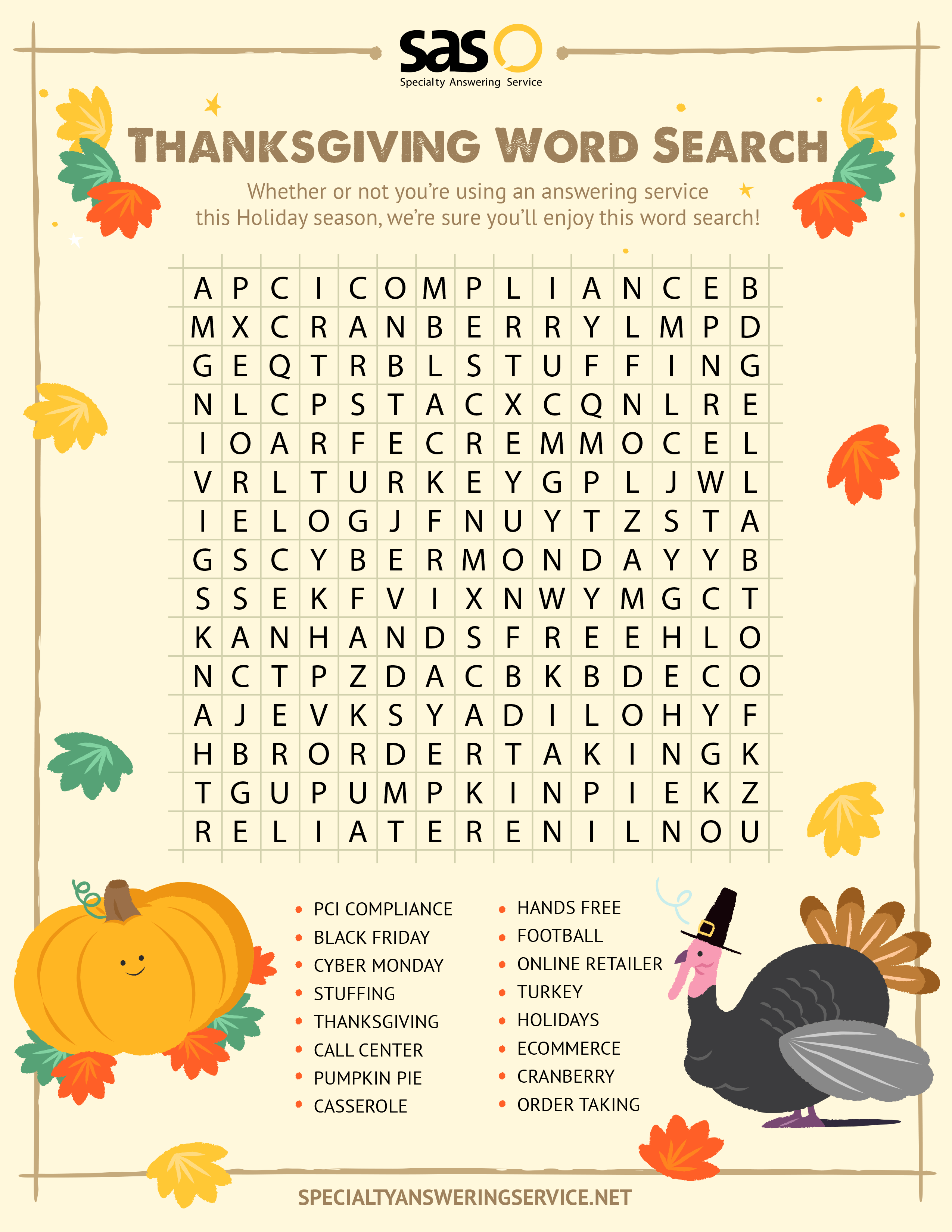 To help celebrate, we created a fun Thanksgiving themed word search puzzle and seasoned it with your favorite answering service lingo. Relax knowing that we’ll be answering your calls while you’re filling up on Turkey. Specialty is always serving up live answering service as the main course, and we’ve included all your go to sides, too – like eCommerce, PCI Compliance, and Call Center!