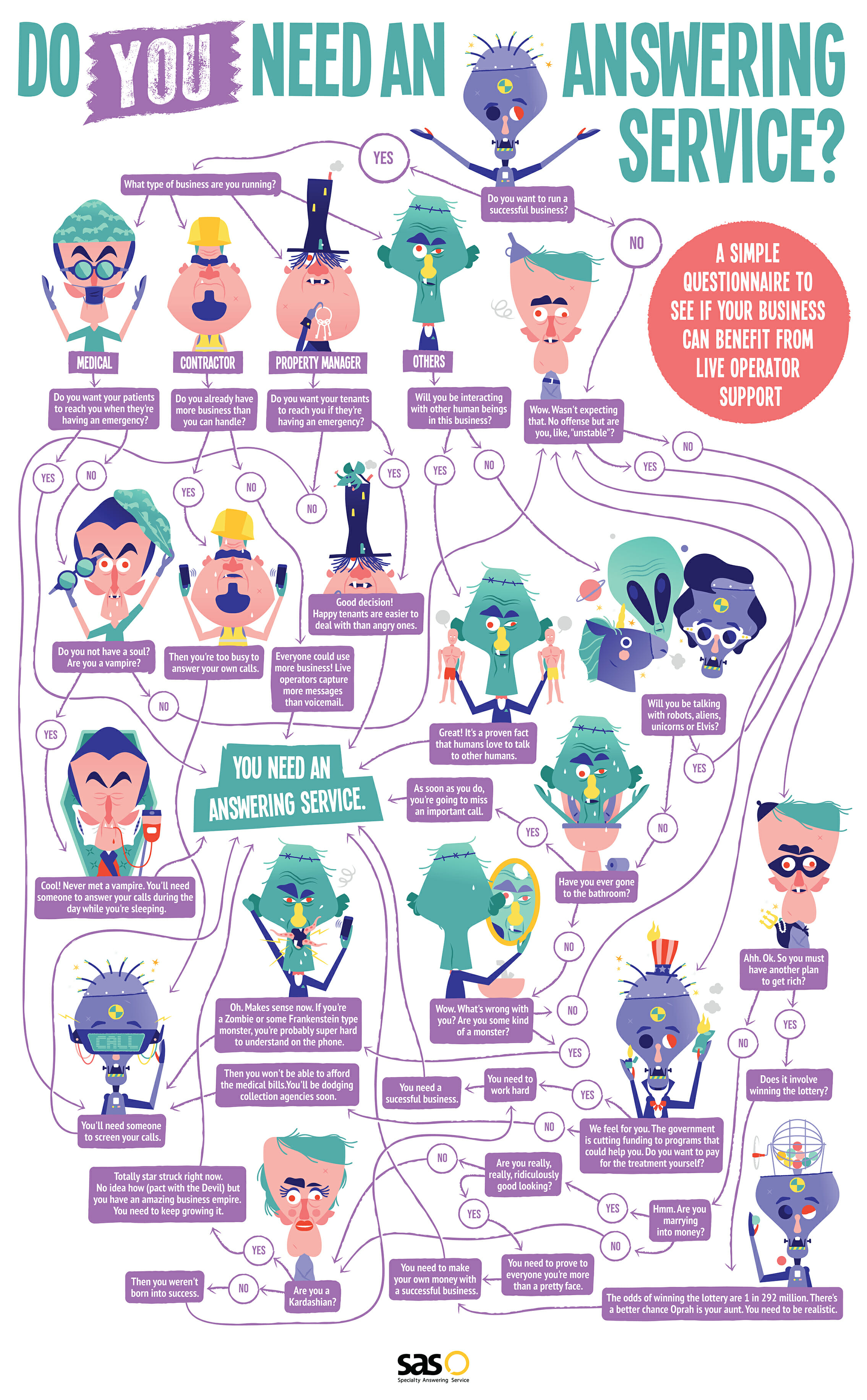 Do you need an answering service? If you’ve been too busy to even think about asking yourself this question, that means you need to start looking for an answering service. Whether you’re a medical professional or a professional dog walker, answering services offer businesses of all sizes the tools they need to succeed. From being available 24 hours a day and helping book more appointments, to screening calls and providing that extra touch of customer support, we know an extra set of hands (or 100) is just the thing your business needs. Still don’t believe us? Follow the flow chart below and see for yourself!
