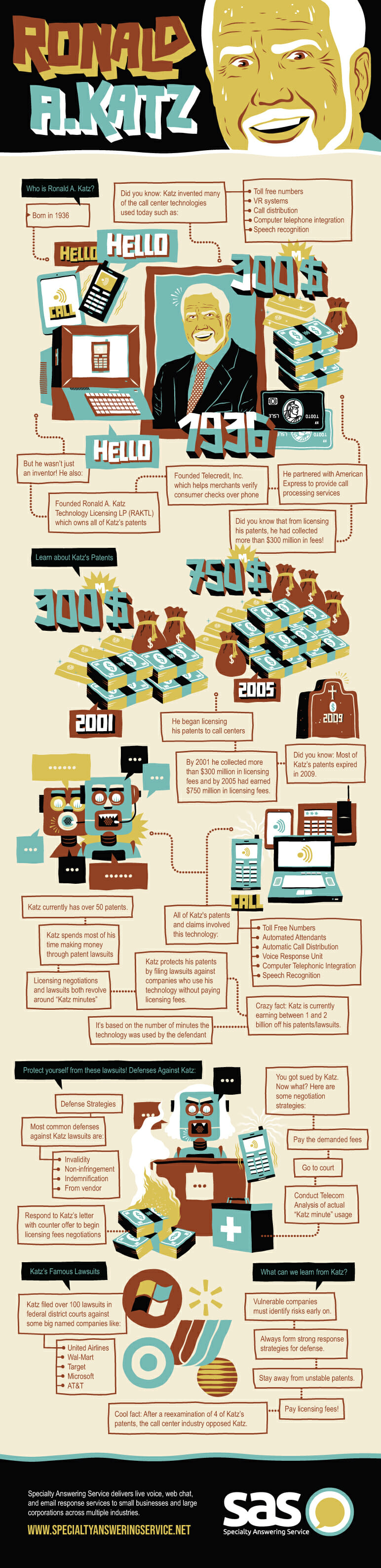Katz has over 50 patents, but spends most of his time making money through lawsuits. In fact, he is currently earning between 1 and 2 billion off of various patents and lawsuits. Essentially, if a company is using technology that he created and is not paying licensing fees, chances are they will feel the wrath of Katz and suffer the due consequences (aka, they’re gonna get sued). For more information on Ronald A. Katz, his inventions, and how to protect yourself against him, continue reading our infographic.