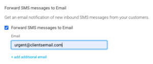 • Turn on SMS alerts: If you want you and your staff to receive email notifications of new inbound SMS messages from your callers, activate the Forward SMS messages to Email option within your Number settings. You can include up to 5 email addresses to receive notification by clicking the + add additional email button below the text box. When you receive a new inbound SMS message to one of your SAS numbers, you’ll be alerted via text.