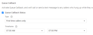 • Queue Callback: When activated, Queue Callback will dial your callers back if they hang up while waiting for 30 seconds or longer while in queue. You elect to activate the feature, choose to trigger the callback for all callers or only first time callers, and dictate the timeframes where the Queue Callback is activated (timeframe is in EST).If you’d prefer to send your mobile callers a Text instead of having us call them back, check the Send an SMS Message box to activate. Then, fill in the SMS text you want sent to callers. Any callers who’ve hung up after waiting for at least 30 seconds for a call to be answered will receive your text message.
